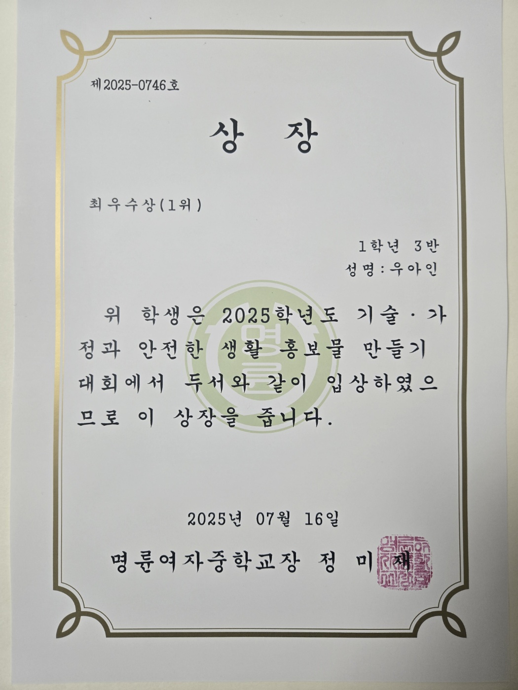 2025학년도(1학기)' 안성 명륜 여자중학교 1학년 우아인 수상!!!을 축하합니다.
